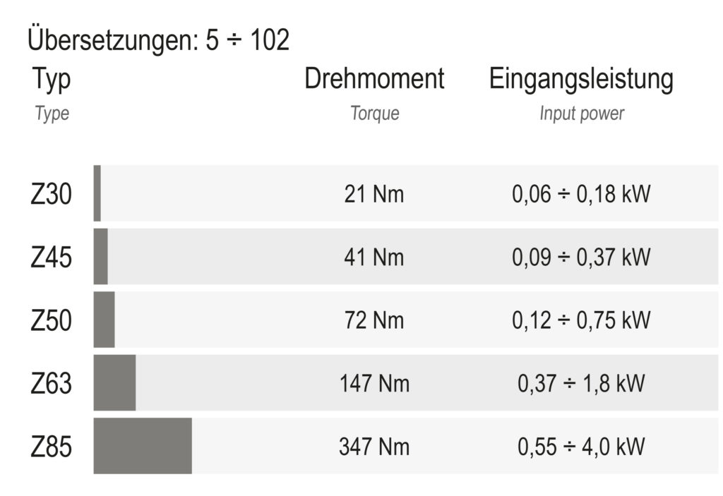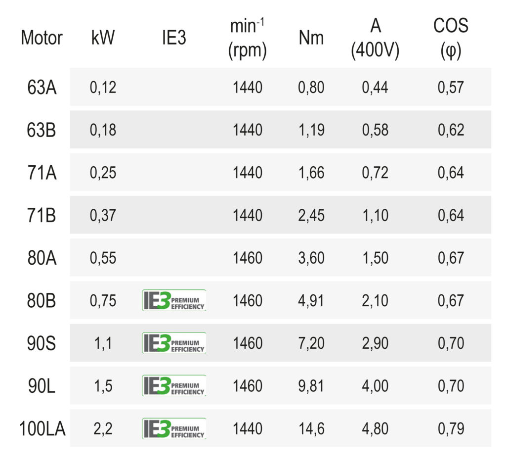 - Die Motore sind dank verlustarmer Statorbleche, Vakuumimprägnierung der Wicklungen und Magnetdrahte für Umrichterbetrieb mit großem Regelbereich bei konstantem Drehmoment optimiert.